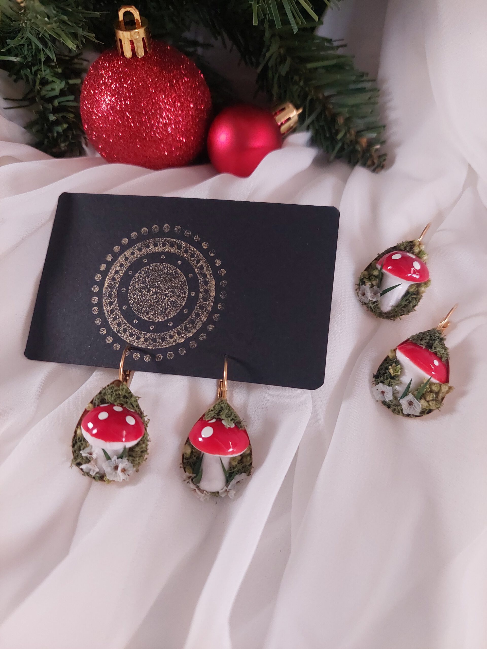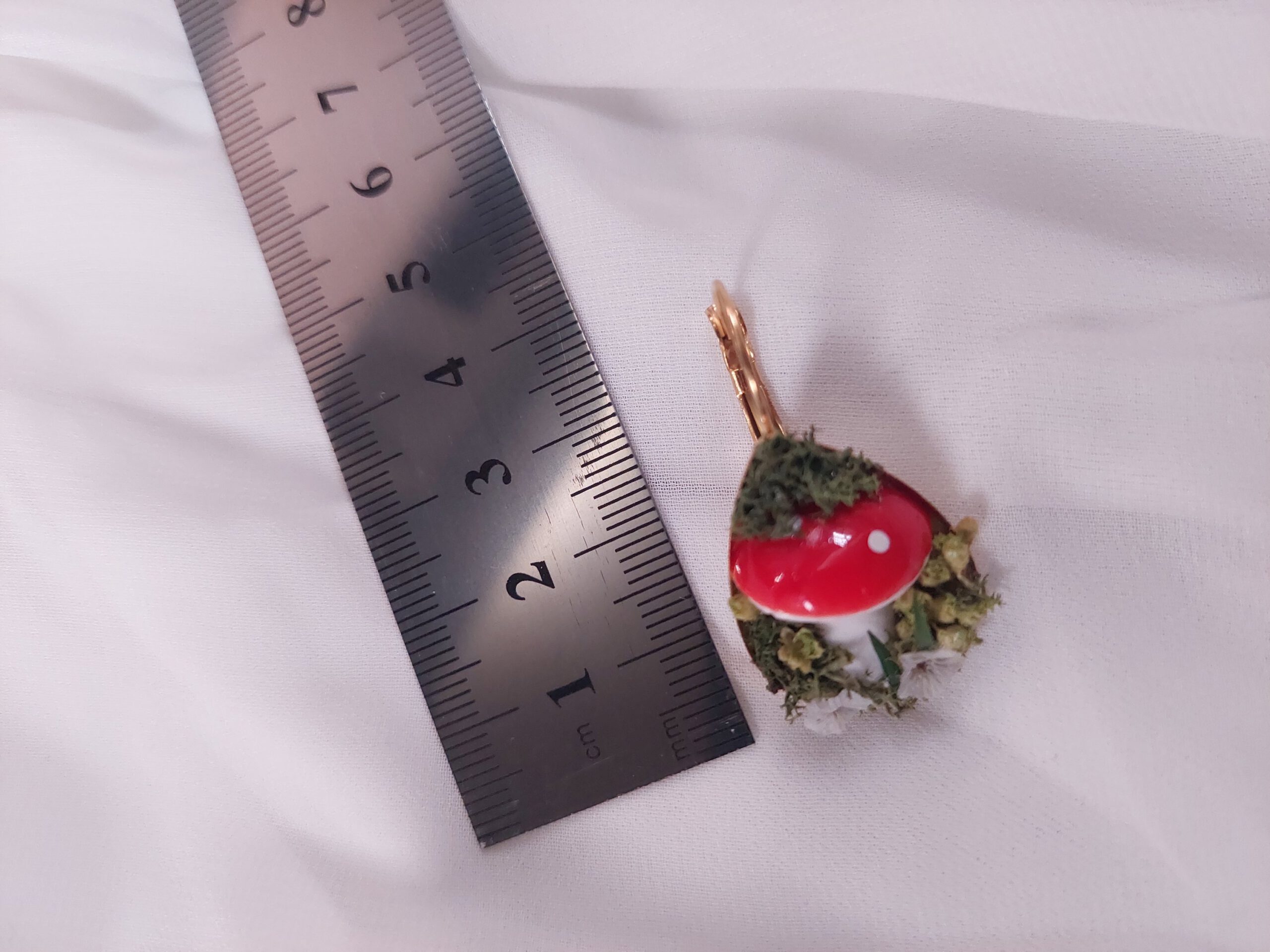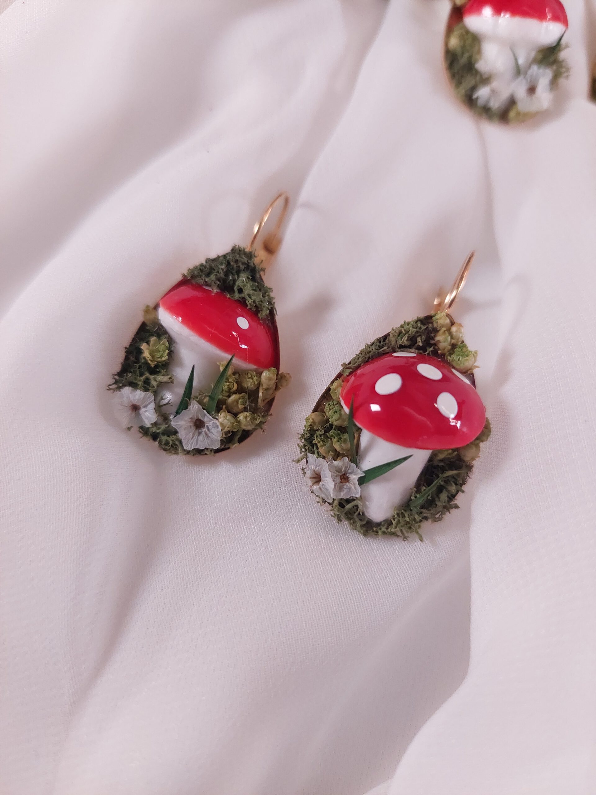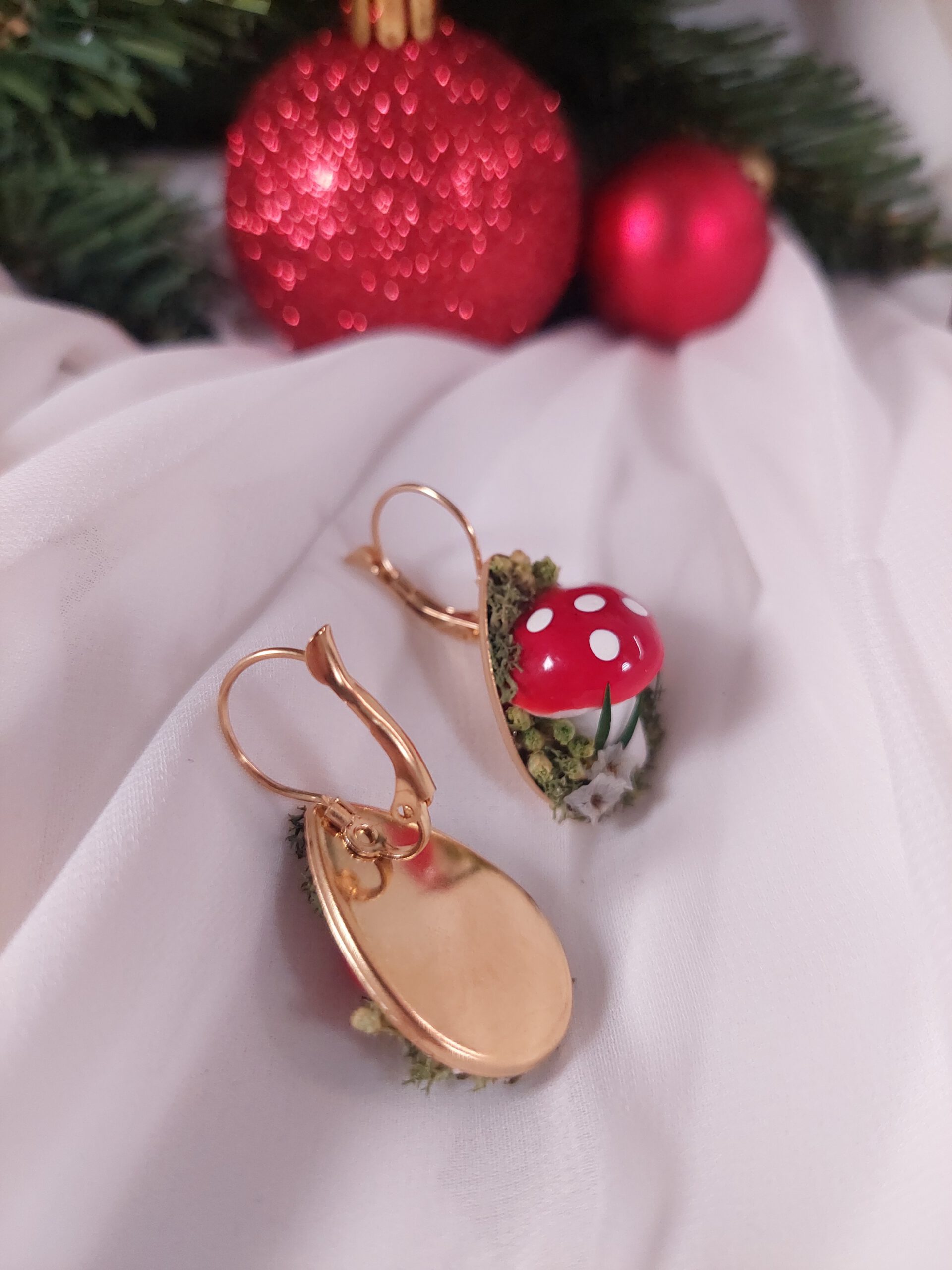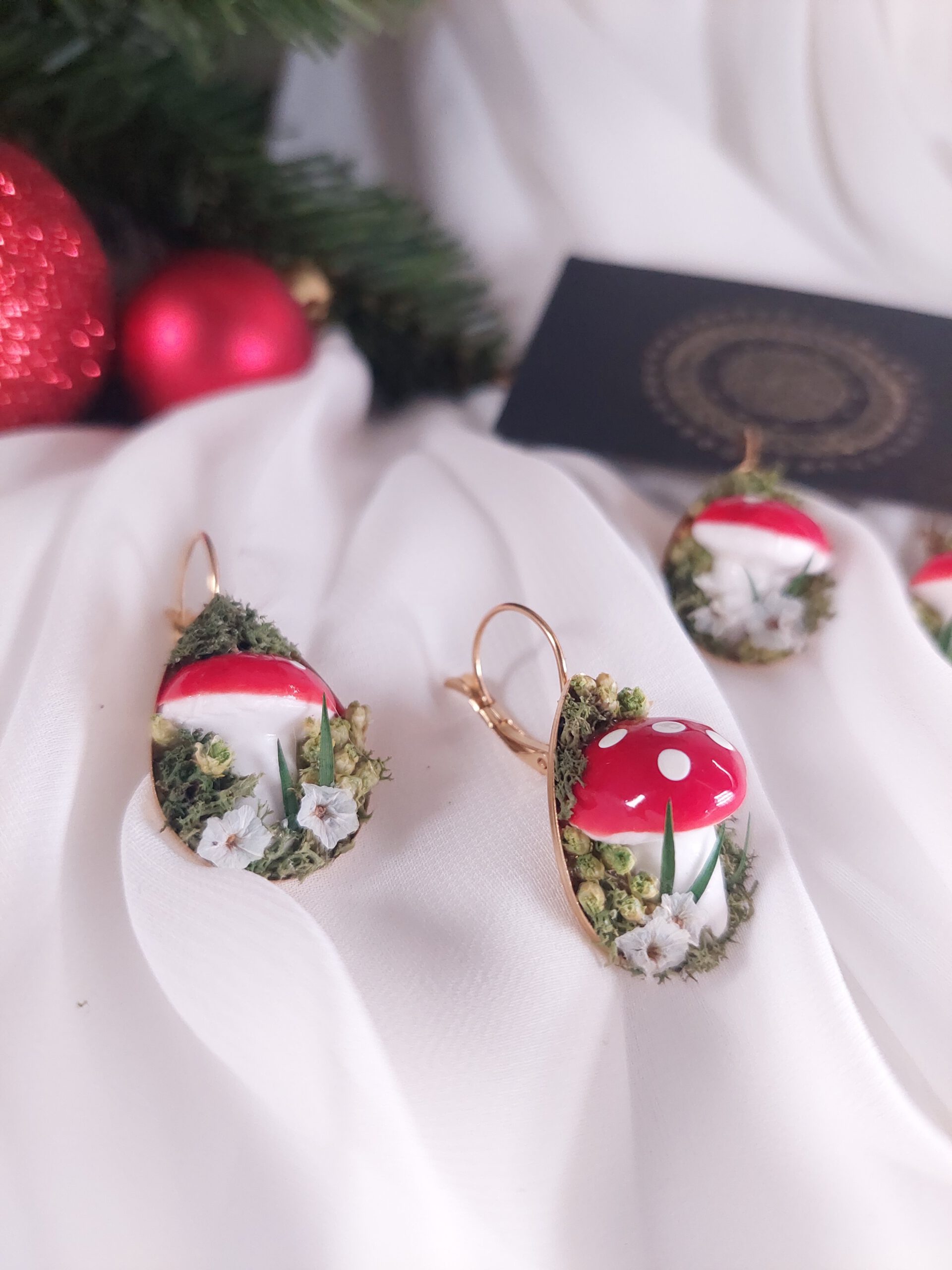 Diese goldenen Ohrringe bringen einen Hauch von Märchenwald in den Alltag. Jeder Ohrring wird sorgfältig von Hand gefertigt und mit feinen Trockenblumen, sanftem Moos und detailreichen Fliegenpilz Miniaturen verziert.