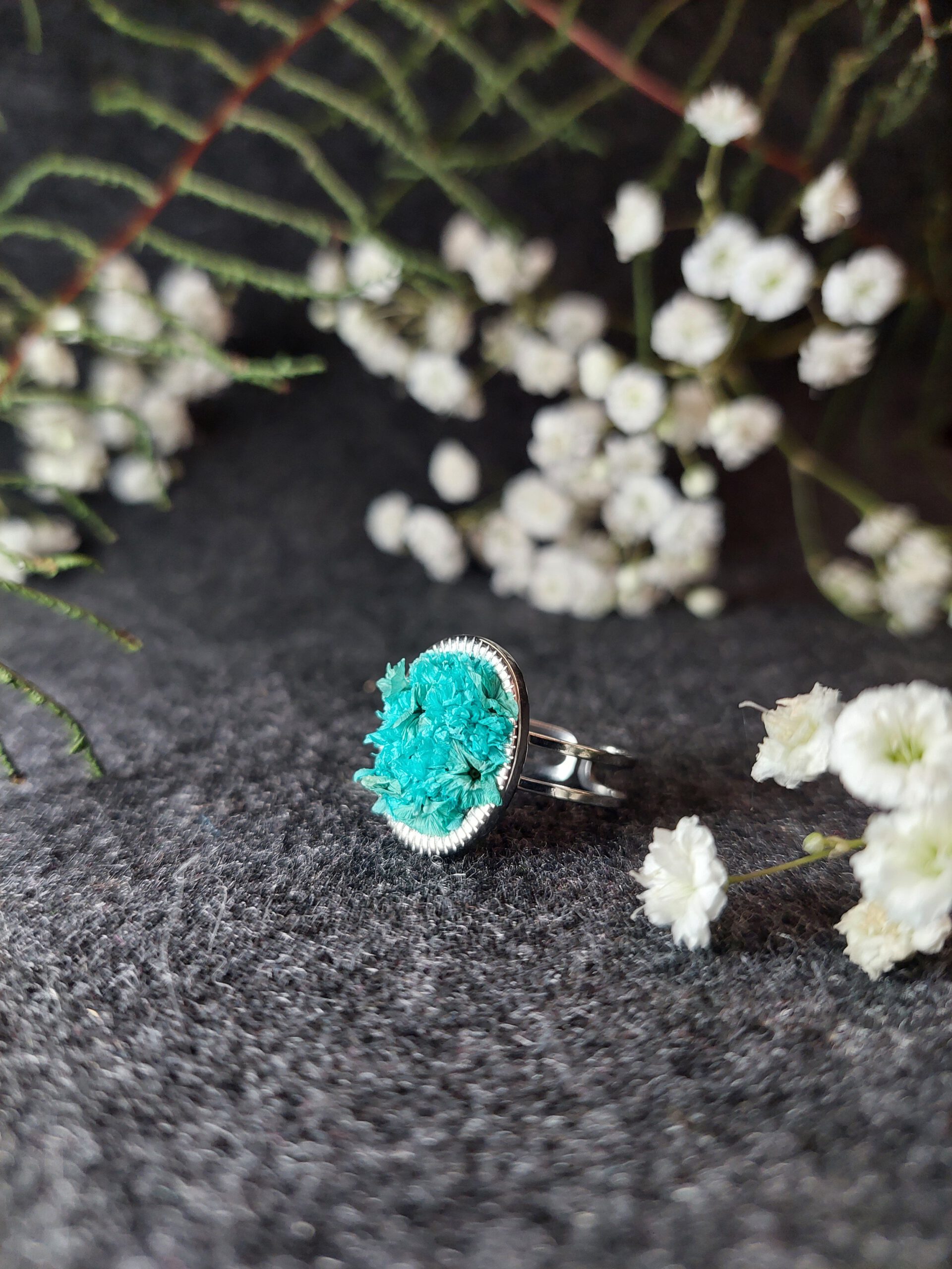 Jeder Ring wird mit viel Liebe zum Detail von Hand gefertigt und ist ein echtes Unikat. Die Kombination aus filigranem Design und echten, sorgfältig getrockneten Blüten macht jedes Stück zu etwas ganz Besonderem. Ideal als Geschenk oder als persönliches Lieblingsstück.