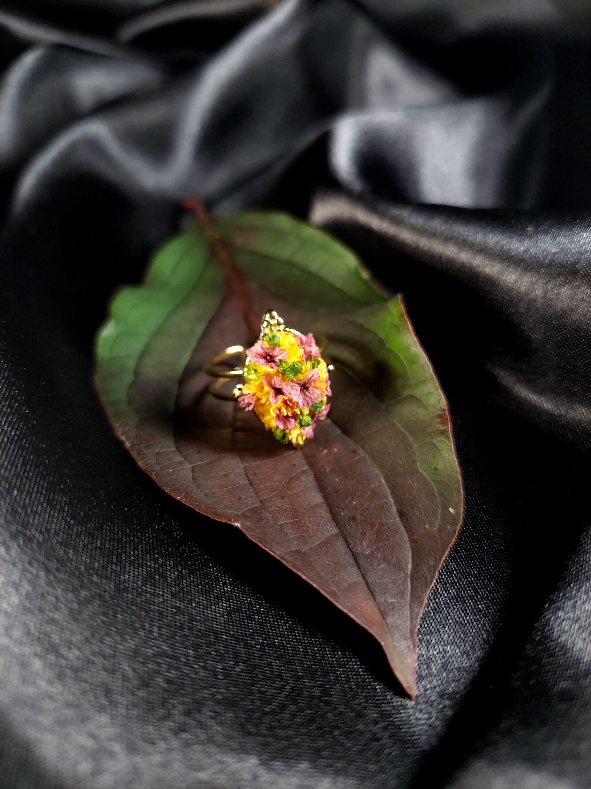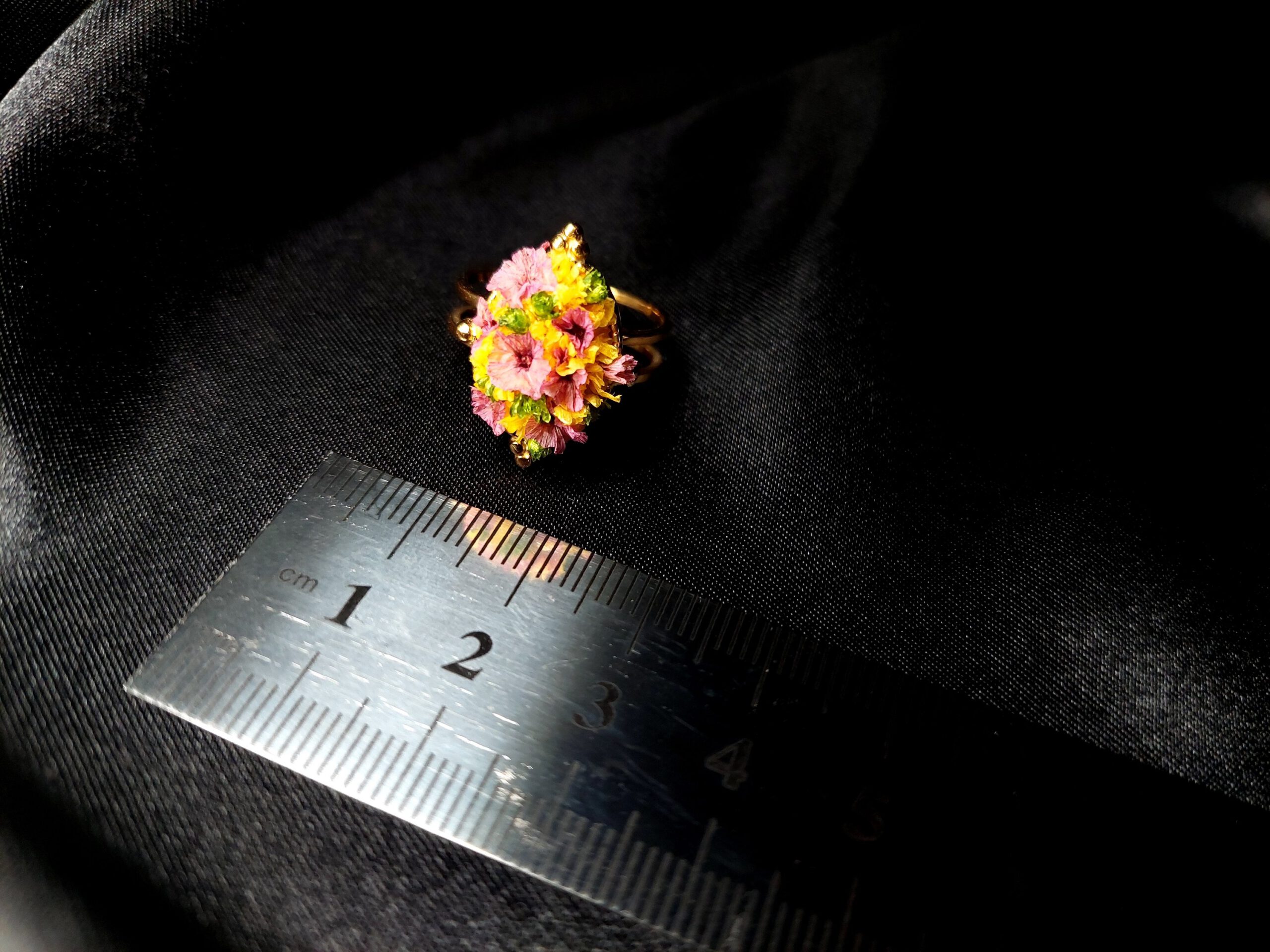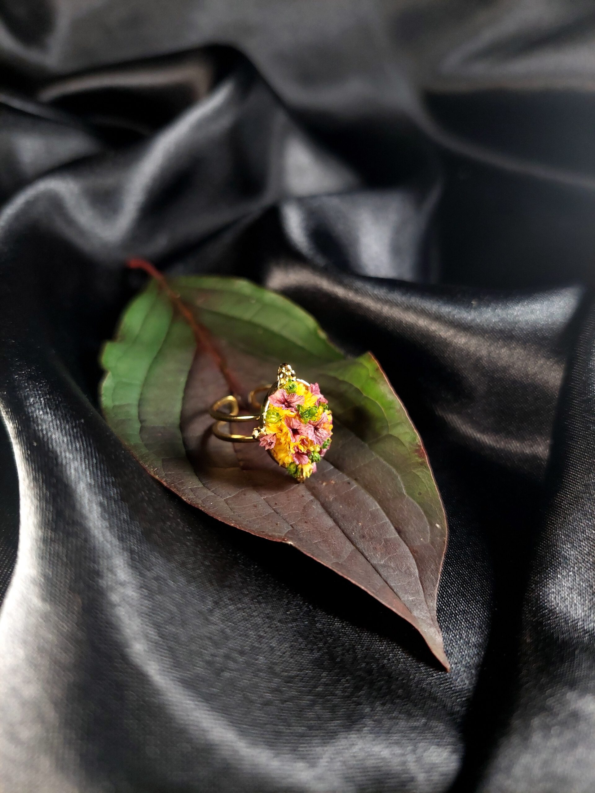 Der Ring vereint echte Blüten in leuchtendem Gelb, Grün und Rot – eingefasst in warm schimmerndem Gold-Edelstahl.